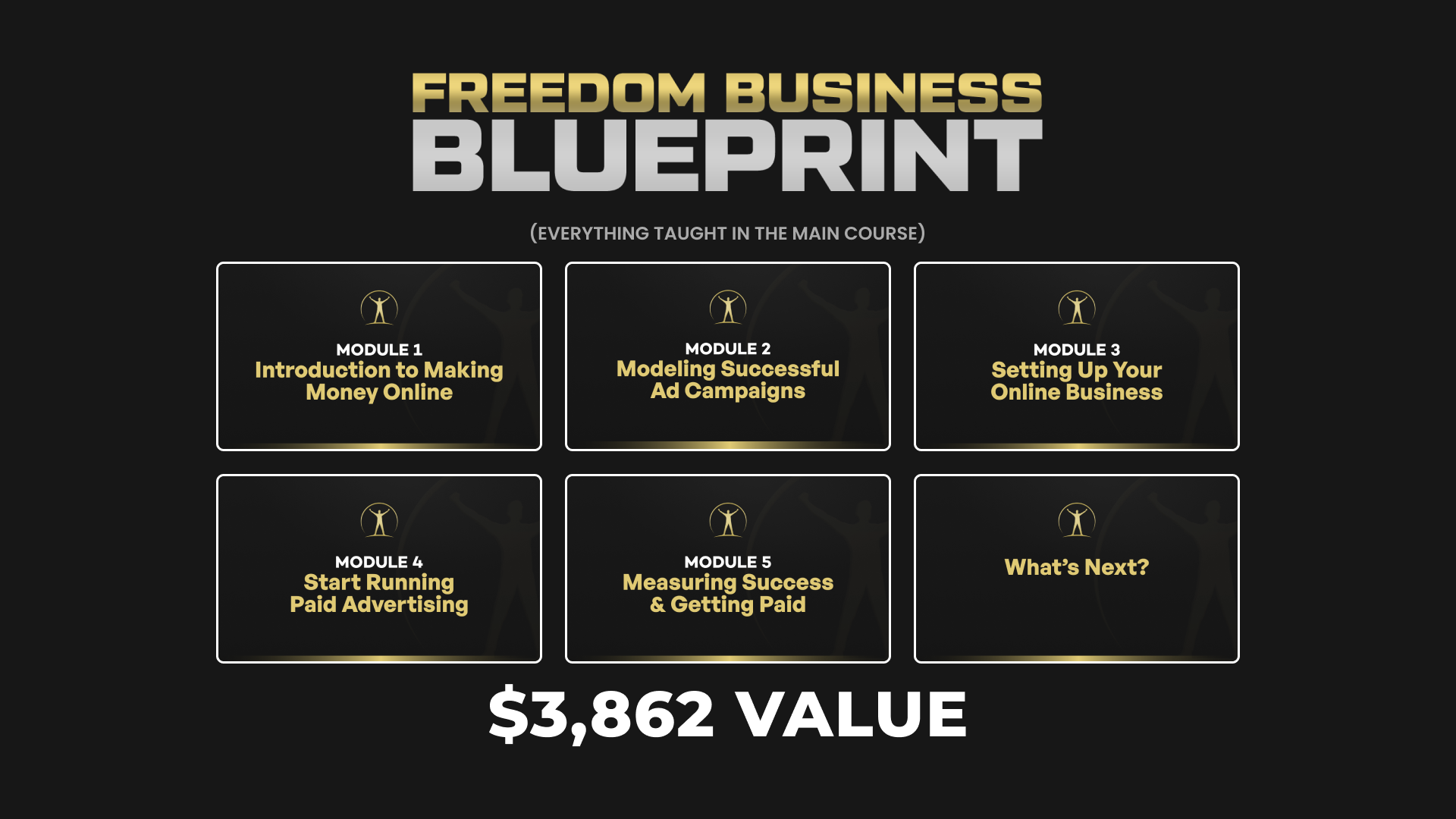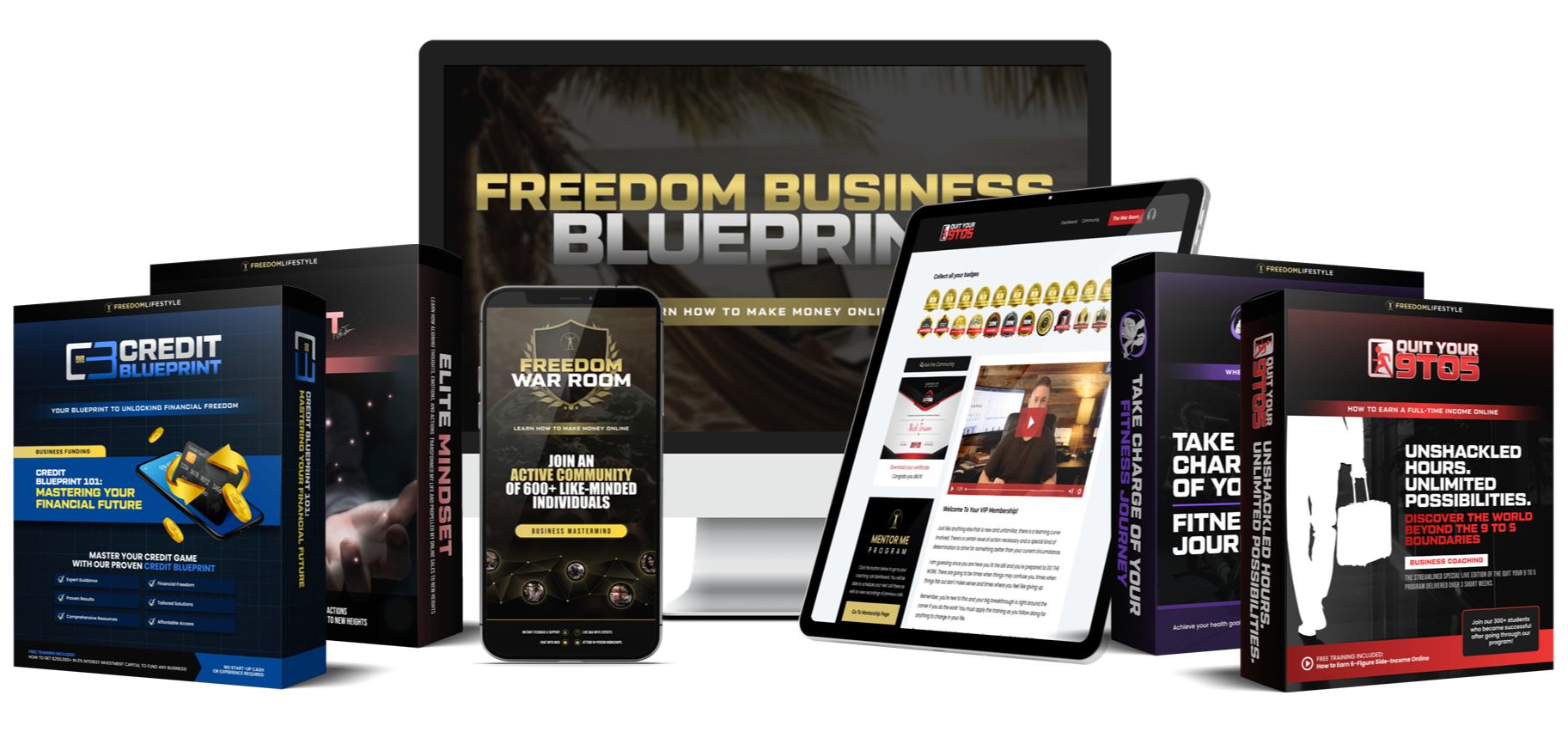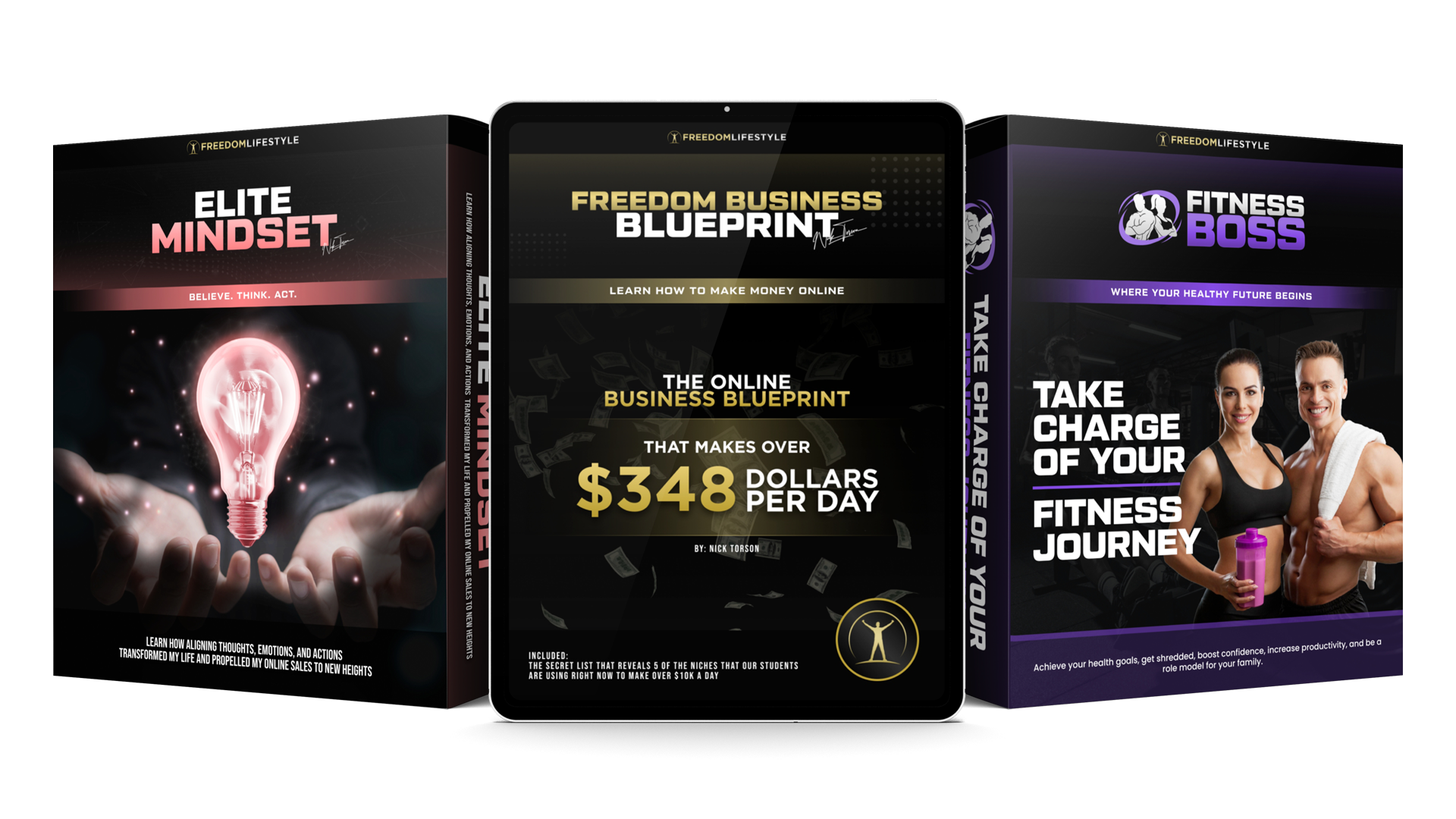 You get access to EVERYTHING! Elite mindset, Fitness Boss, Freedom Business Blueprint, Credit blueprint, Quit Your 9 to 5 training portals & The Freedom War Room business mastermind.Â